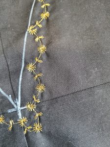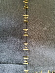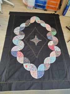 Ég skrifaði um þetta teppi um daginn.  Það fór svo ofan í skúffu á meðan hönnuðurinn og saumakonan ígrundaði næstu skref.  Nú eru nokkur skref til viðbótar orðin að veruleika.   Mér fannst alltaf eitthvað vanta meira í miðjuna og ákvað því að ná í gylltan þráð (þar sem að mínu mati fer vel á svartann bakgrunn) og nýta skrautsporin á vélinni minni. Ég strikaði línur til að fara eftir og þetta er útkoman.