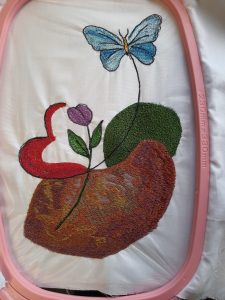 Ég ákvað að bæta smávegis í bakgrunninn og klippti því út nokkur form og lagði á bakgrunnsefnið en undir filmuna. Ég setti líka tear-away stabilizer undir og festi svo allt lottið í útsaumshring sem ég átti til ofan í skúffu…..   Littli sæti Open-Toe Sensor Matic Free-Motion fóturinn minn var sóttur…. og þá var bara að byrja að sauma…..