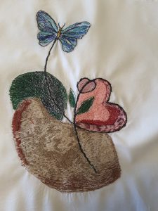 Um eftirmiðdag í gær ákvað ég að spreyta mig í því sem á enskunni kallast Thread painting.  Samkvæmt YouTube myndbandi sem ég vafraði á um daginn þá er þetta nefnilega ágætis æfing í því að nota “Free-motion” tæknina en það er einmitt það sem ég er að æfa mig í undanfarið.
