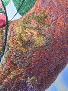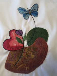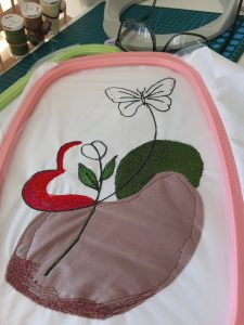 Ég ákvað að bæta smávegis í bakgrunninn og klippti því út nokkur form og lagði á bakgrunnsefnið en undir filmuna. Ég setti líka tear-away stabilizer undir og festi svo allt lottið í útsaumshring sem ég átti til ofan í skúffu…..   Littli sæti Open-Toe Sensor Matic Free-Motion fóturinn minn var sóttur…. og þá var bara að byrja að sauma…..